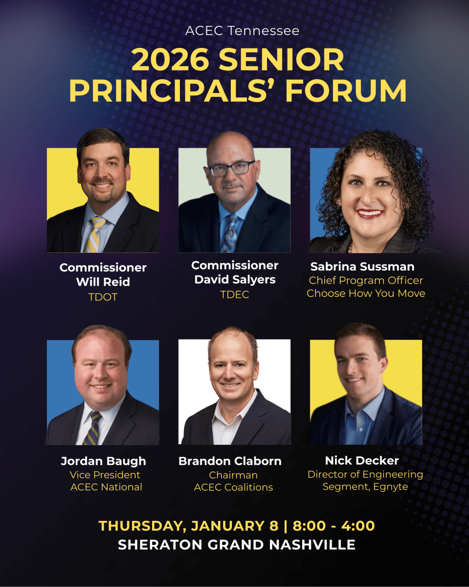 Designed for senior leaders and decision-makers at our member firms, ACEC Tennessee’s annual Senior Principals’ Forum brings colleagues together from across the state for a full day of conversations and presentations centered on the business of engineering in Tennessee. A detailed agenda will be shared the first week of January.